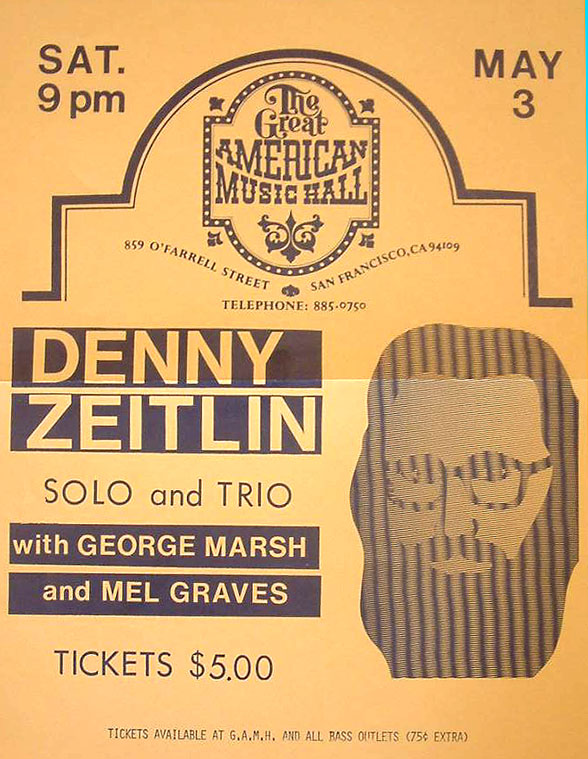 | Trio with George Marsh and Mel Graves—Great American Music Hall—Poster, ’69…An elegant slice of old San Francisco with a funky feel, this venue supported jazz for about a decade before yielding to more commercial genres. |