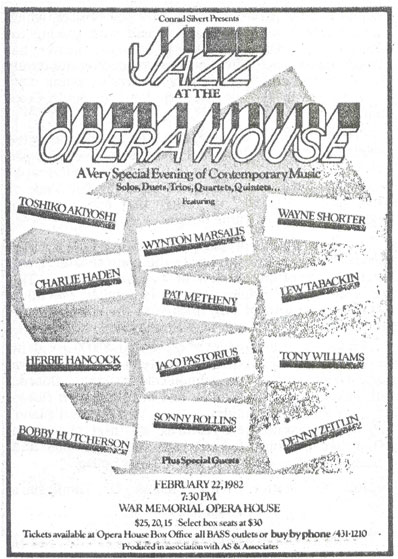 Jazz at the Opera House—Poster, ’82. Jazz musicians loved Conrad Silvert—as a human being, jazz writer, and huge supporter of the music. In his early thirties he began a losing battle against testicular cancer. He asked some musicians with whom he felt particularly close to participate in a benefit concert to help defray his huge medical bills. We were all very touched to be part of what everyone knew would be Conrad's musical epitaph. The spirit and collaboration that night was very special, and the concert lasted well over three hours. (click here for more info) |