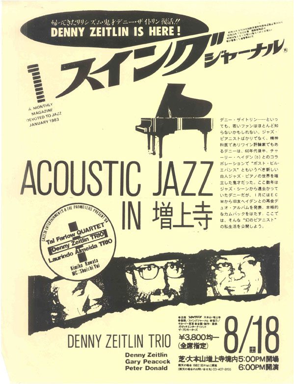 | Promo Flyer: Japanese collage, ’83-'84 DENNY ZEITLIN TRIO Japan Tour—August, 1984 Preceded by a feature in Japan’s Swing Journal, this tour was really a ball. Gary filled in for Charlie Haden, and immediately got into the music and added his own special stamp. We started at the Edmonton, Alberta Jazz Festival, and began our Japanese tour the next day. We were picked up at the airport and rushed to the venue barely in time to play. The rest of the tour was much more sedate, with concerts every other night, and plenty of time to explore Tokyo, Nagoya, Osaka, and Kyoto with the aid of a personal translator/guide. Apart from some really great music, and very appreciative audiences, the highlights for me were a classic Kaiseki banquet in Kyoto that lasted 5 hours, and our last dinner in Japan where I had my first taste of Kobe beef. |